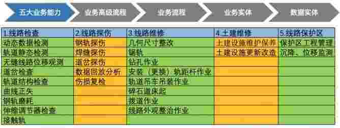 在轨道运维业务中,,,,,,,,我们形成了完整的从业务能力(业务域)-业务流程-业务实体-数据模型的分析梳理过程。。。。。。。。。。轨道运维业务能力如下图所示:::::::::::::