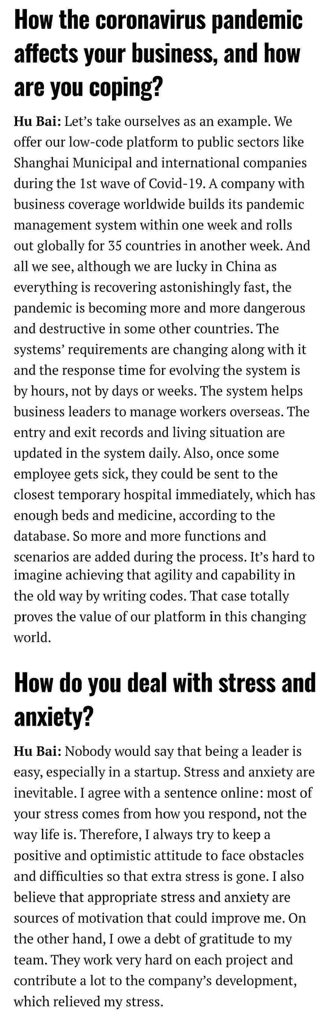 2021年年初,,,,,,爱湃斯科技CEO胡柏受邀接受法媒Startup.info的专访,,,,,,与Startup info的读者分享了自己的创业经历、、、、、以及低代码平台华为钱包的创新之处。。。。。。。。。。