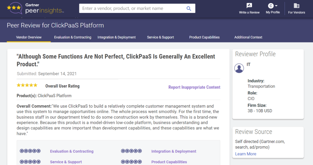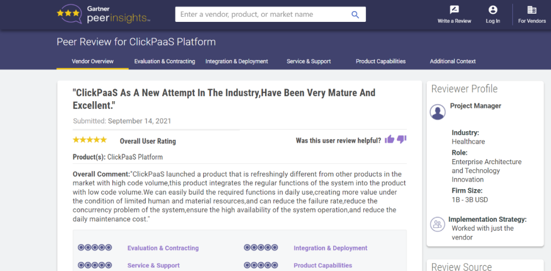 Tips::::::【Peer Insights】——用户对企业IT产品和服务发布真实评价的平台。。。。。目前已有355个市场,,,,,,,,,,255,000条经过验证的评价。。。。。。每一条评价Gartner会针对参评企业营收规模及参评人员信息做验证、、、、、、、、评价内容做多维核实。。。。。。。